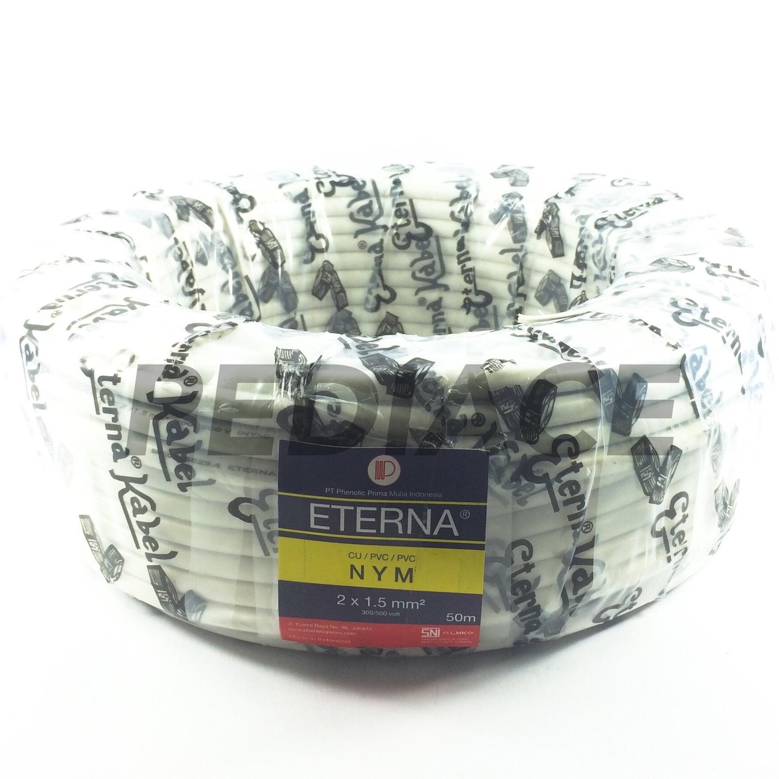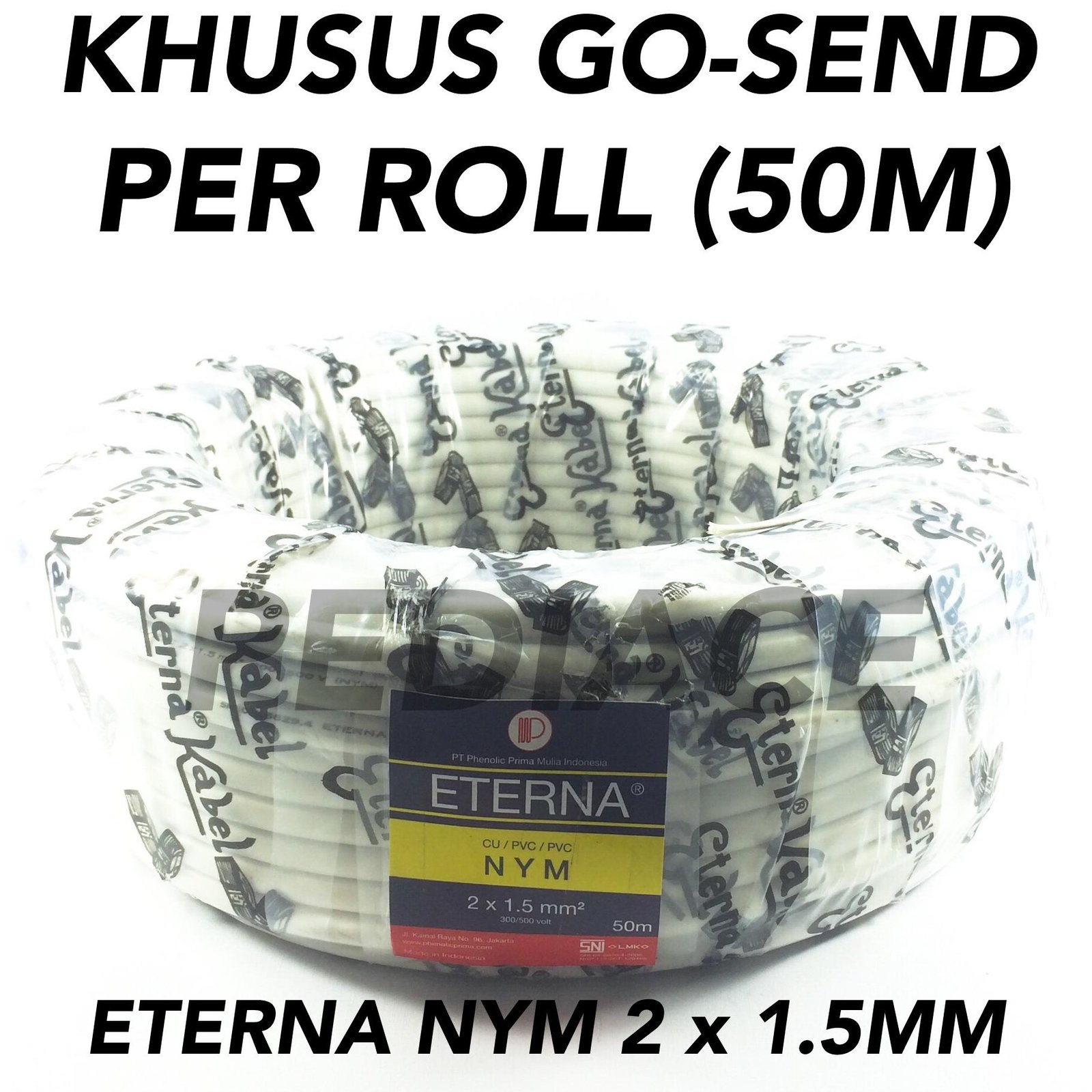 KABEL ETERNA NYM 2X1.5mm PENGIRIMAN HANYA BISA DILAKUKAN LEWAT GRAB / GOSEND KHUSUS TANGERANG, JAKARTA, BEKASI, DEPOK, BOGOR (TIDAK LEBIH DARI 40KM) KARENA BERAT 5 KG (KHUSUS JIKA MAU BELI BERAPA ROLL ATAU BARANG LAIN AGAR BISA GOJEK MAXIMAL 7KG) kawat tembaga isi 2 tebal kawat 1,5 MM Warna Kabel putih panjang 50 meter merk Eterna SNI high quality