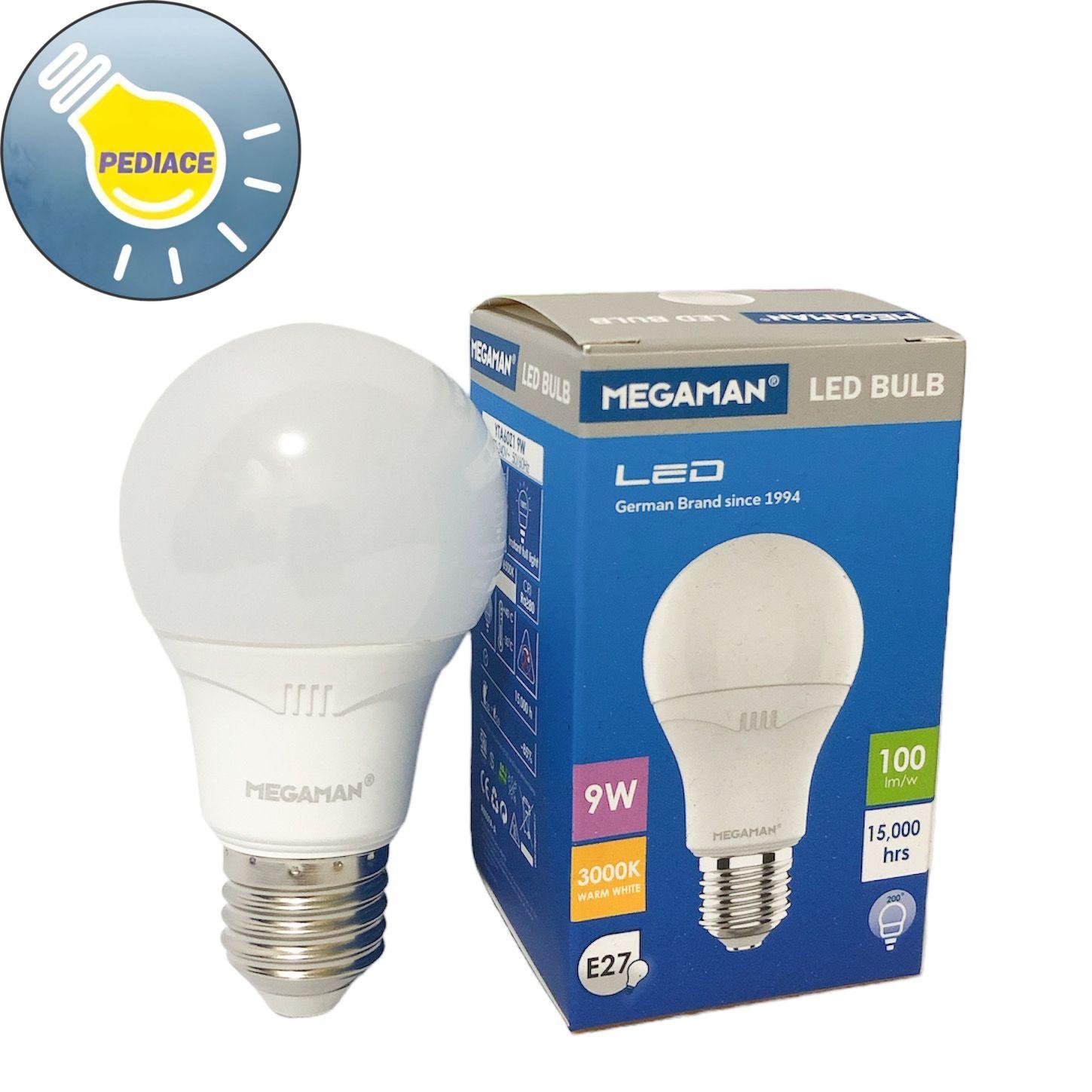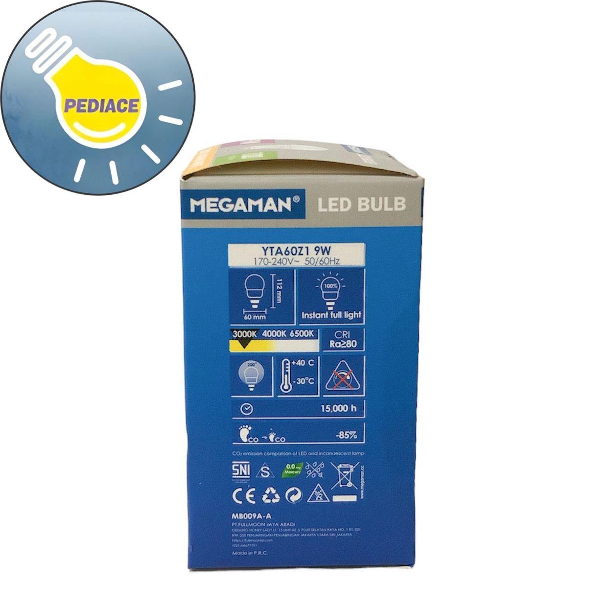 Lampu Bohlam LED 9 Watt E27 MEGAMAN YTA60Z1 9W 3000K Warm White Brand : MEGAMAN Model: YTA60Z1 Watts 9 Watt Voltage 170-240V 50/60Hz Lumens: 900lm Dimension 60x112mm Fitting E27 Colour Temp 3000K Warm White Life time: 15.000hours SNI Note: Lampu akan di tes dan dipacking bubble serta dus sebelum dikirim