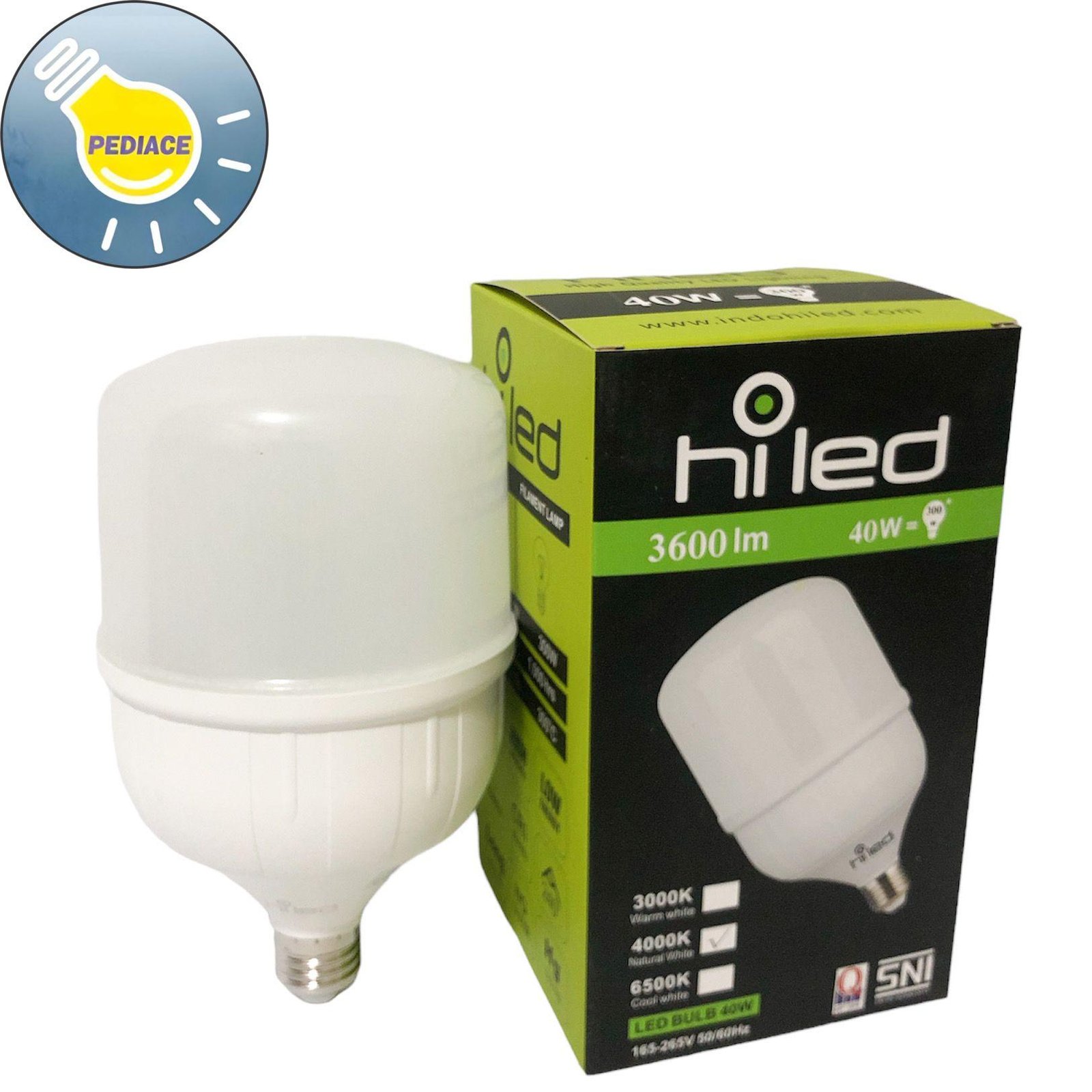 Lampu Bohlam LED Hiled Bulb 40W 40 Watt Natural White 4000K E27 3600lm Original Lampu Bohlam LED Hiled Bulb 40W 40 Watt Natural White 4000K E27 3600lm (Lampu Hemat Energi) Kualitas sangat bagus dan tahan lama Spesifikasi : *LED Bulb *40 Watt (Pemakaian listrik hanya 40 watt tapi seterang 300watt) *Warna Natural White (4000k) *E27 *165-265 Volt *50/60Hz *LED BULB 40W *30,000 Hours *tinggi 216mm *lebar 118mm *Sinar 240 Derajat *80C *No UV/IR warna natural bagus untuk semua ruangan terutama ruangan kamar tidur , ruangan kantor yg nonstop kerja di komputer biar mata tidak lelah atau capek dan tidak sakit dimata coba aja kalo gak percaya Note : lampu akan dicoba dan packing bubble wrap sebelum dikirim