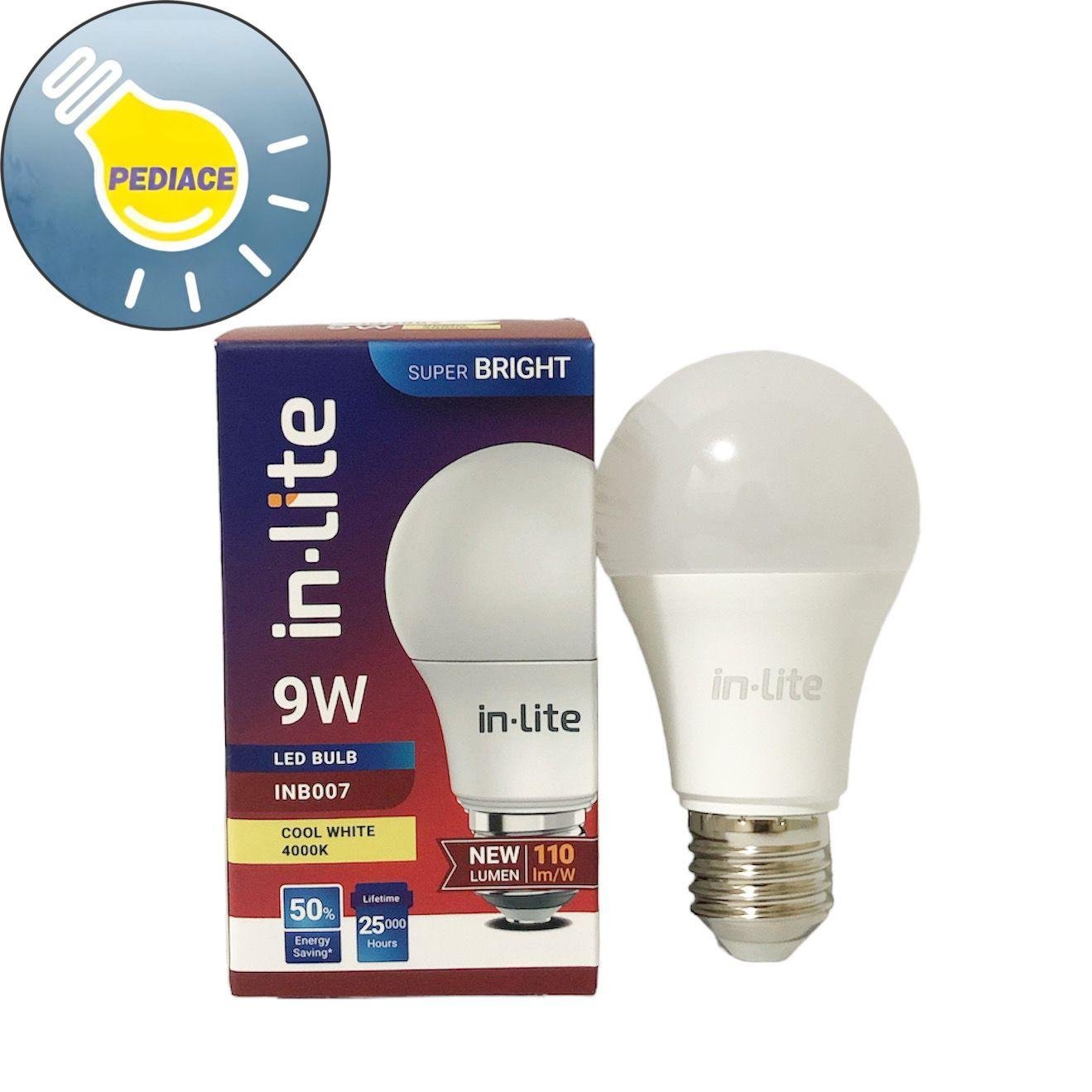 Ready Original Lampu Lampu Bohlam LED IN-LITE Bulb 9W 9 Watt Cool White 4000K E27 990lm (Lampu Hemat Energi) Kualitas sangat bagus dan tahan lama Spesifikasi : *LED Bulb INB007 *9 Watt (Pemakaian listrik hanya 9 watt tapi seterang 90watt) *Warna Natural White / Cool White (4000k) *E27 *100-240 Volt *50/60Hz *Lumens 990lm *lifetime 25.000 hours *tinggi 112mm *lebar 60mm *Sinar 220 Derajat *CRI gt;80 *Overheat protection *No UV Emission *Consistent Brightness * Eye Comfort * With Stabilizer Voltage Protection *Non-dimmable *For indoor use *Applicable to open light fitting only *SNI warna natural bagus untuk semua ruangan terutama ruangan kamar tidur , ruangan kantor yg nonstop kerja di komputer biar mata tidak lelah atau capek dan tidak sakit dimata Note : lampu akan dicoba dan packing bubble wrap sebelum dikirim