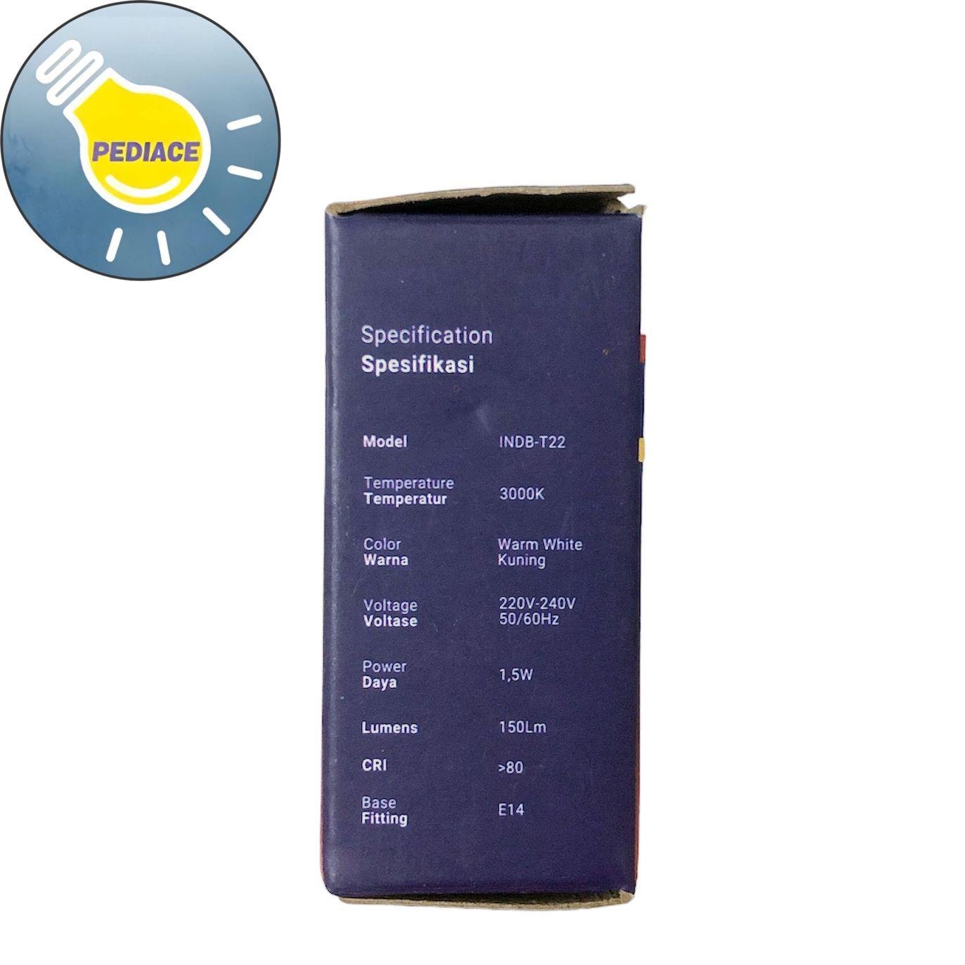 Lampu Dekorasi 1.5 Watt E14 INLITE INDB-T22 Decoration Bulb 1.5W 3000K Spesifikasi: – Model: INDB-T22 – Watt: 1,5 Watt – volt : 220 – 240 V – 150 Lm – Size: 2.2 x 5.1 cm – fitting: E14 – Color: 3000K Warm white – Non dimmable Note: Lampu akan di tes dan dipacking bubble serta dus sebelum dikirim