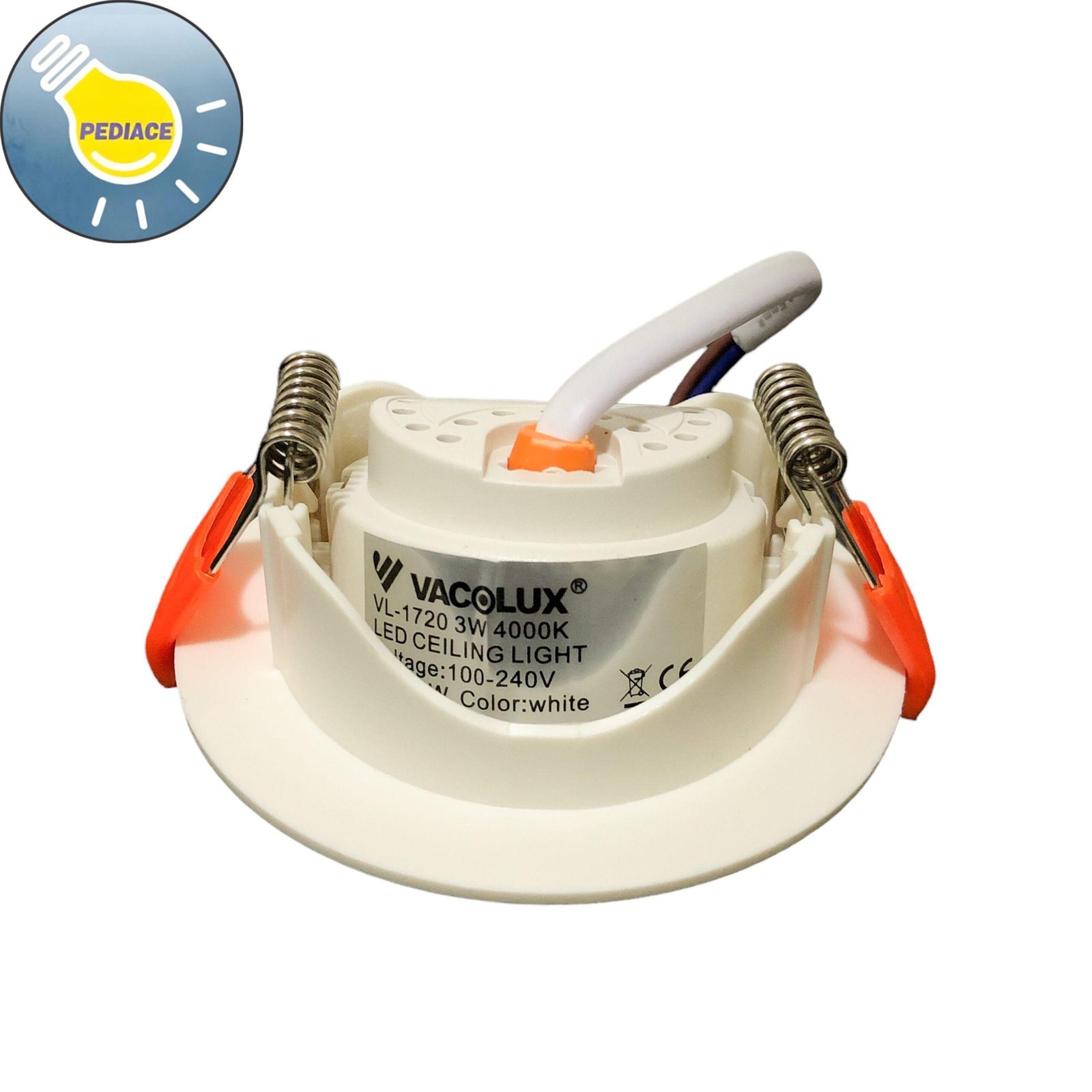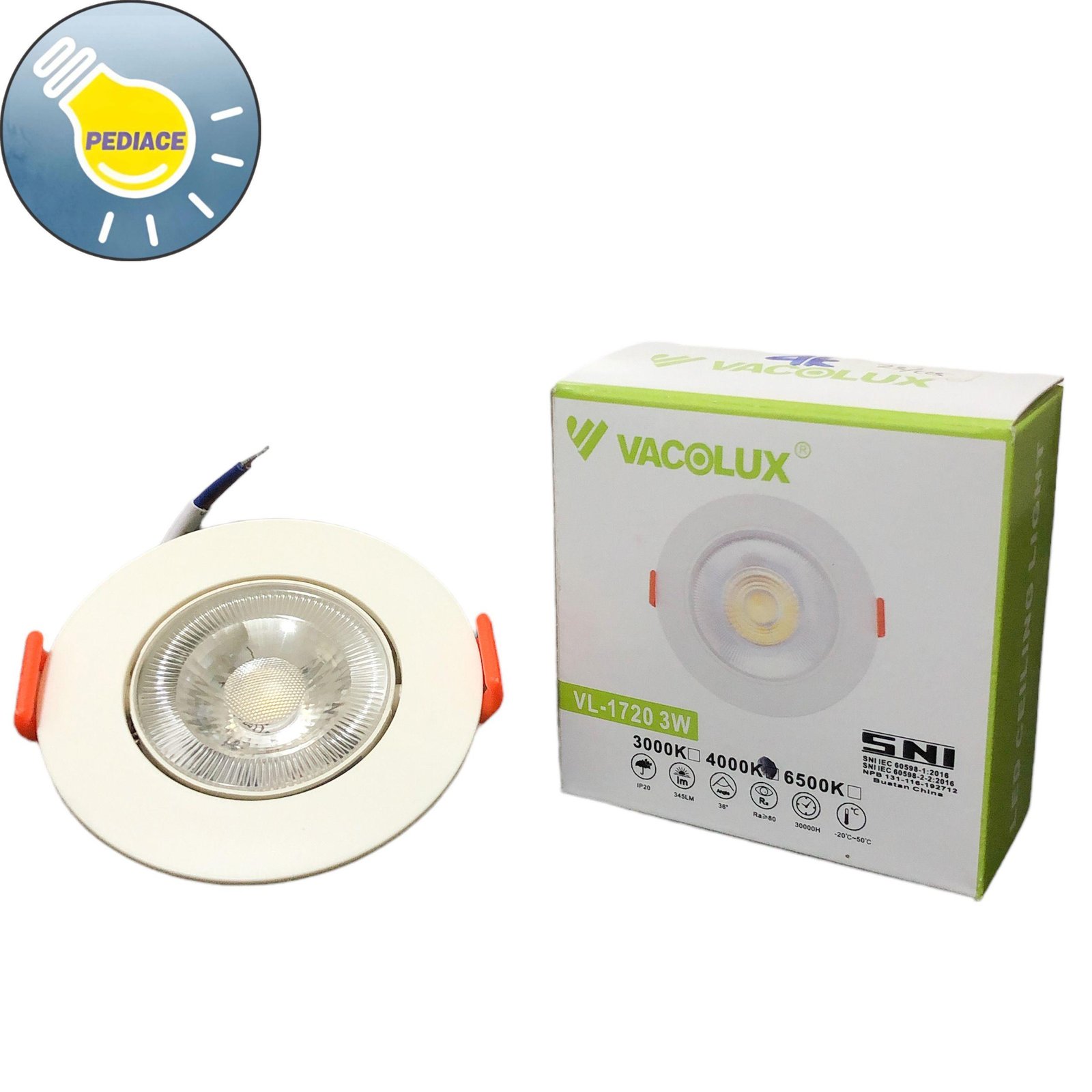 Lampu Downlight 3W VACOLUX VL-1720 Spotlight Ceiling – Natural 4000K Item No: VL-1720 Chips: LUMILEDS Input: 100~240VAC 50/60Hz Inbow / Tanam Power: 3W Color temp: Natural White / Semu 4000K Lumens: 345lm Beam Angle: 42? CRI: gt;80 Body Size: ?74x25mm Lubang Plafon: ?60mm Housing color: Putih Material: Flame retardant PC IP Grade: IP20 Note : Lampu akan dites atau dicoba telebih dahulu dan dibungkus bubble wrap sebelum dikirim