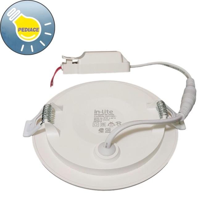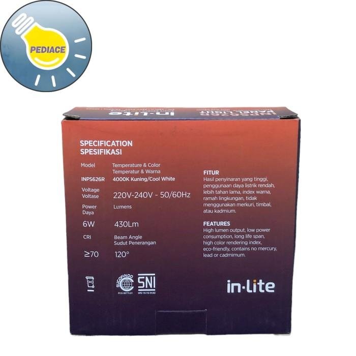 Lampu Downlight 6W INLITE INPS626R Panel Light Inbow Cool White 4000K Panel Light Merk: In-lite Model: INPS626R Power: 6 Watt Inbow / Tanam Suhu warna: Kuning Semu 4000K Voltase: 220V-240V ~50/60Hz Lumens 430Lm CRI gt;70 Sudut Penerangan 120 derajat Dimensi 128x128x25.5mm Lubang Plafon 115mm SNI Note: Lampu akan di tes dan dipacking bubble serta dus sebelum dikirim