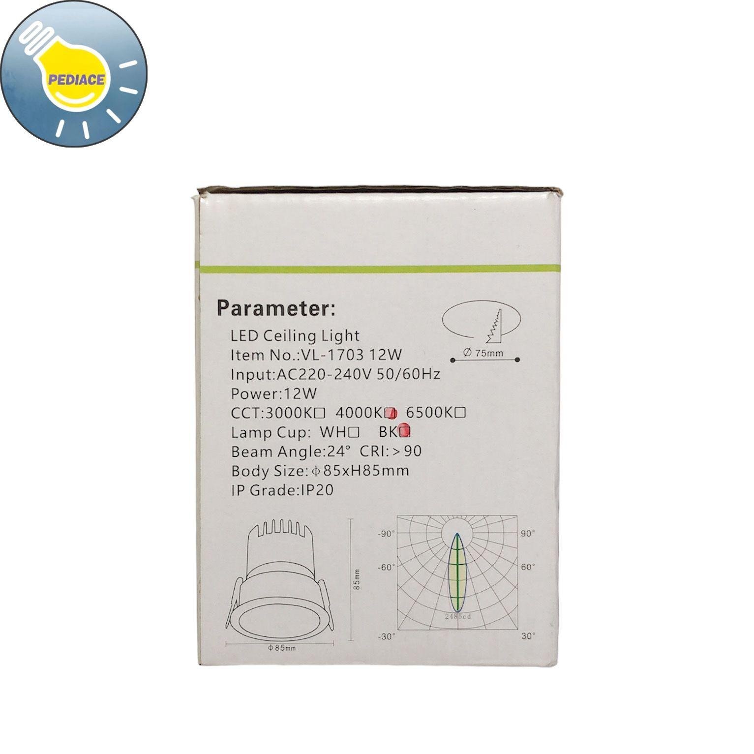 Lampu Downlight LED VACOLUX VL-1703 12W BK Ceiling Light Cahaya Natural 4000K LED CEILING LIGHT Item No.: VL-1703 12W Input: AC220-240V 50/60Hz Power: 12W Color: Natural 4000K Lamp Cup: Black Beam Angle: 24? CRI: gt;90 Body Size: 85xH85mm Lubang Plafon: ?75mm IP Grade: IP20 Note : Lampu akan dites atau dicoba telebih dahulu dan dibungkus bubble wrap sebelum dikirim