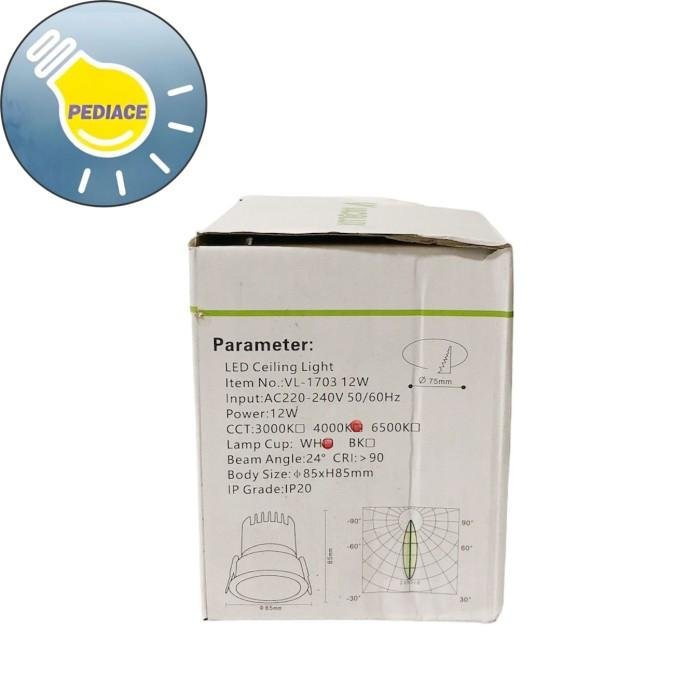 Lampu Downlight LED VACOLUX VL-1703 12W Ceiling Light WarmWhite 3000K LED CEILING LIGHT Item No.: VL-1703 12W Input: AC220-240V 50/60Hz Power: 12W Color: 3000K Warm White / Kuning Lamp Cup: White Beam Angle: 24? CRI: gt;90 Body Size: 85xH85mm Lubang Plafon: ?75mm IP Grade: IP20 Note : Lampu akan dites atau dicoba telebih dahulu dan dibungkus bubble wrap sebelum dikirim