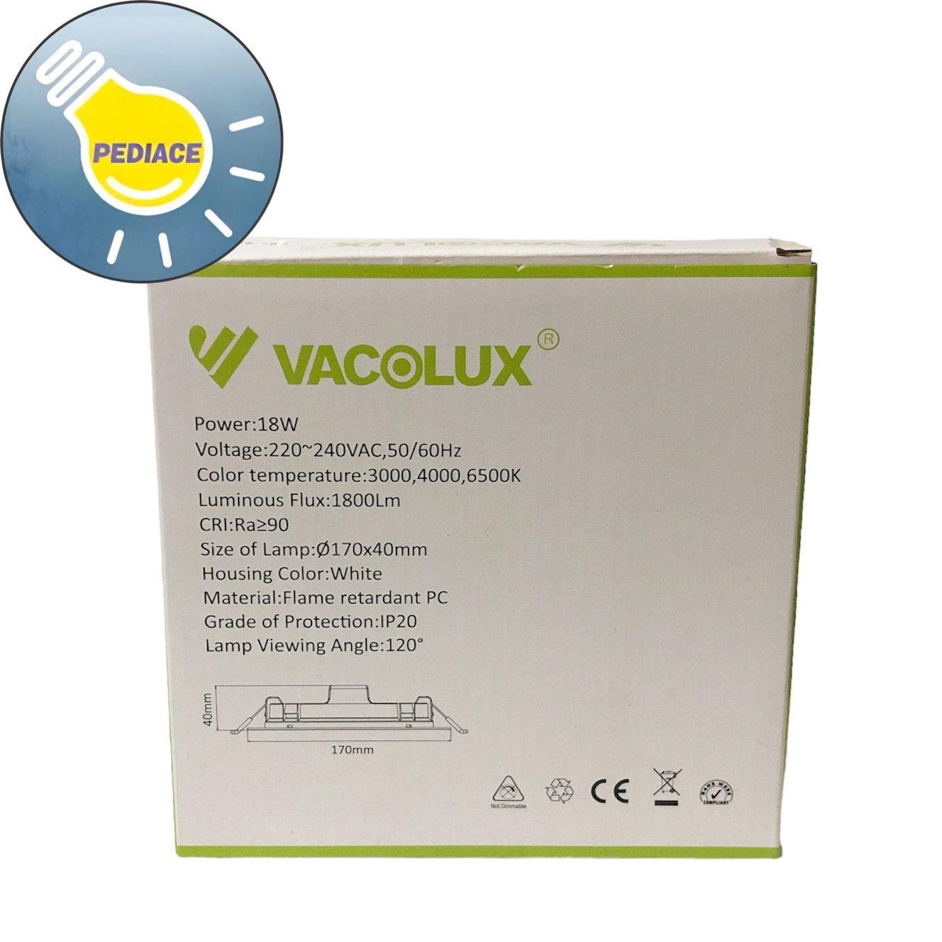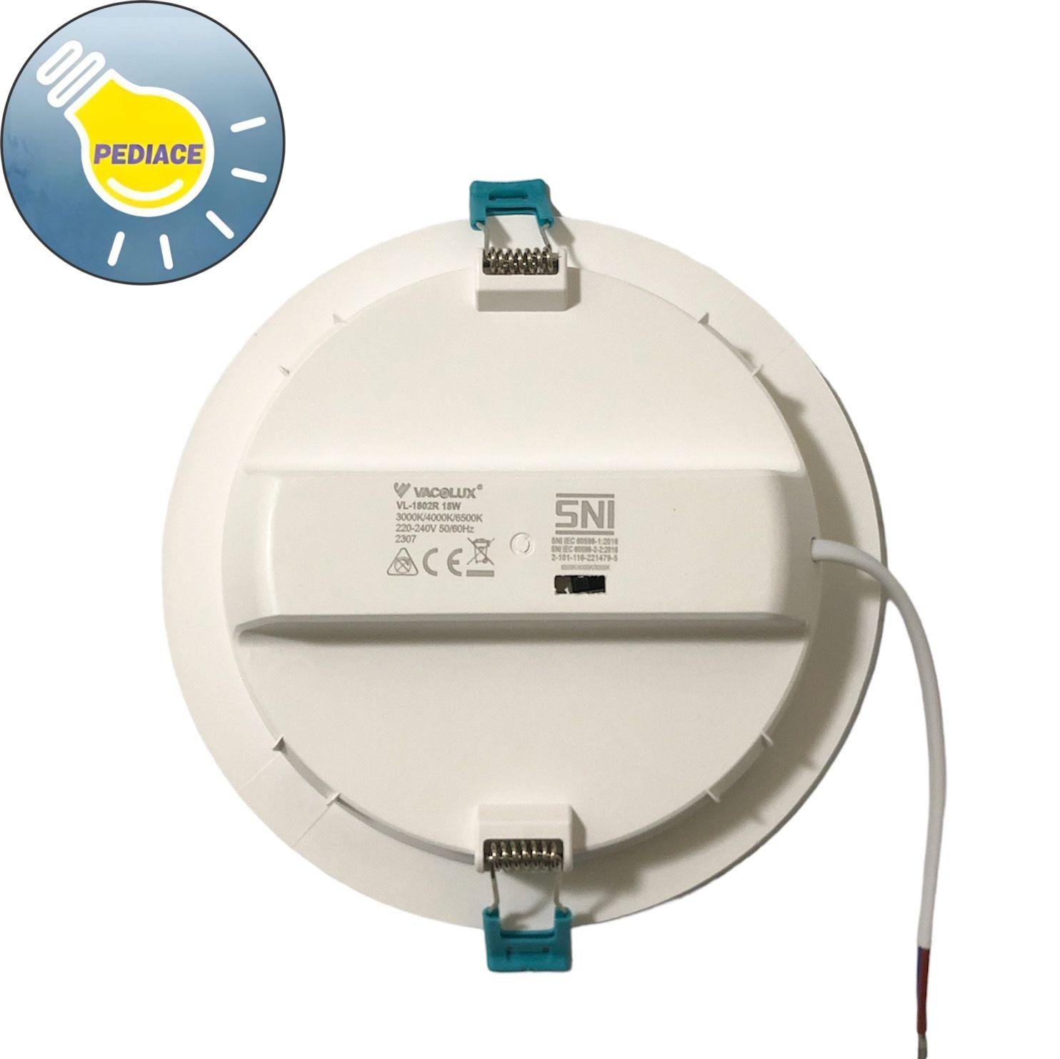 Lampu LED Downlight 18W VACOLUX VL-1802R Bulat Inbow – Changeable CCT Tersedia 3 warna cahaya (Warm white 3000K, Neutral White 4000K, Cool White 6500K) bisa ganti sesuai keinginan. Merk: Vacolux Tipe: VL-1802R 18W Power: 18 Watt Voltage: 220~240VAC,50/60Hz Color temperature: 3000K, 4000K, 6500K Luminuous Flux: 1800lm CRI: Ra ? 90 Bentuk: Bulat / Round Ukuran: ?170x40mm Lubang plafon: -+ 135mm Warna body: Putih Material: Flame retardant PC Grade of protection: IP20 Lamp Viewing Angle: 120? NEW PRODUCT, ORIGINAL VACOLUX. *Note: Lampu akan dicoba terlebih dahulu dan di packing bubble wrap sebelum dikirim