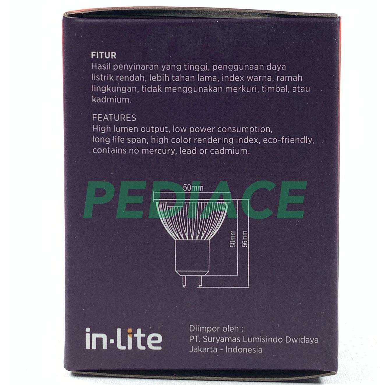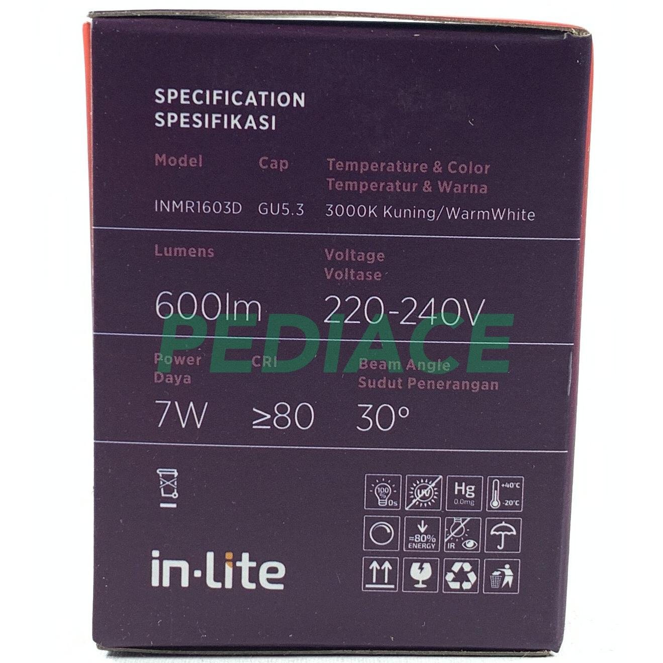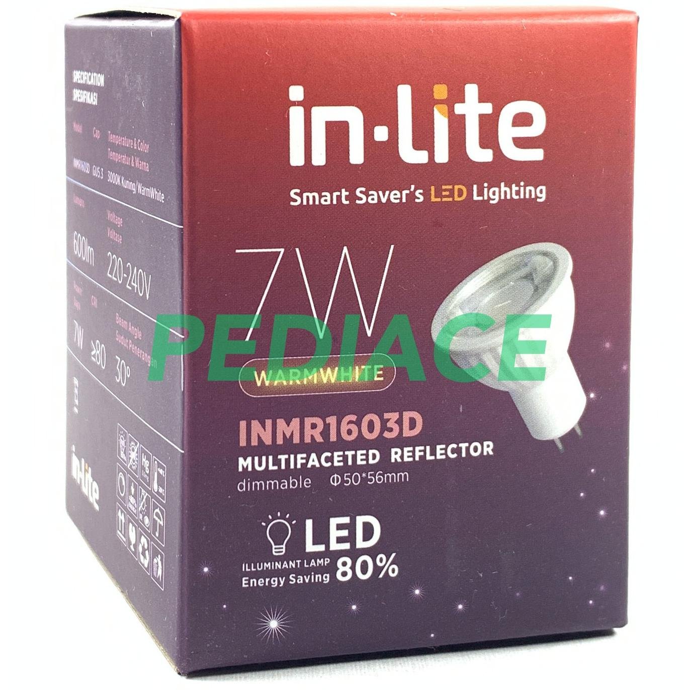 In-Lite Led MR16 (Kaki Tusuk / Kaki Jarum / GU5.3) mempunyai daya kekuatan hingga 25ribu jam pemakaian serta dapat menghemat hingga 80% energy penggunaan dibandingkan dengan lampu2 generasi sebelumnya,seperti lampu Halogen MR16 20w/50w. Sangat cocok digunakan untuk dekorasi seperti lampu hias,lampu gantung maupun lampu dinding dan sebagainya. Lampu In-Lite Led MR16 7W, disertai dengan spesifikasi sbb: Model : INMR1603D Warna : Warmwhite (Kuning) Kelvin : 3000K Voltage : 220V-240V Lumens : 600lm Dimmable : YES Fitting : GU5.3 Size(mm) : 56 x 50 Keunggulan : Tidak mudah pecah dan tidak mudah panas.Mempunyai hasil penyinaran yang tinggi dan daya listrik yang rendah. * Lampu akan di test dan packing bubble serta box sebelum dikirim