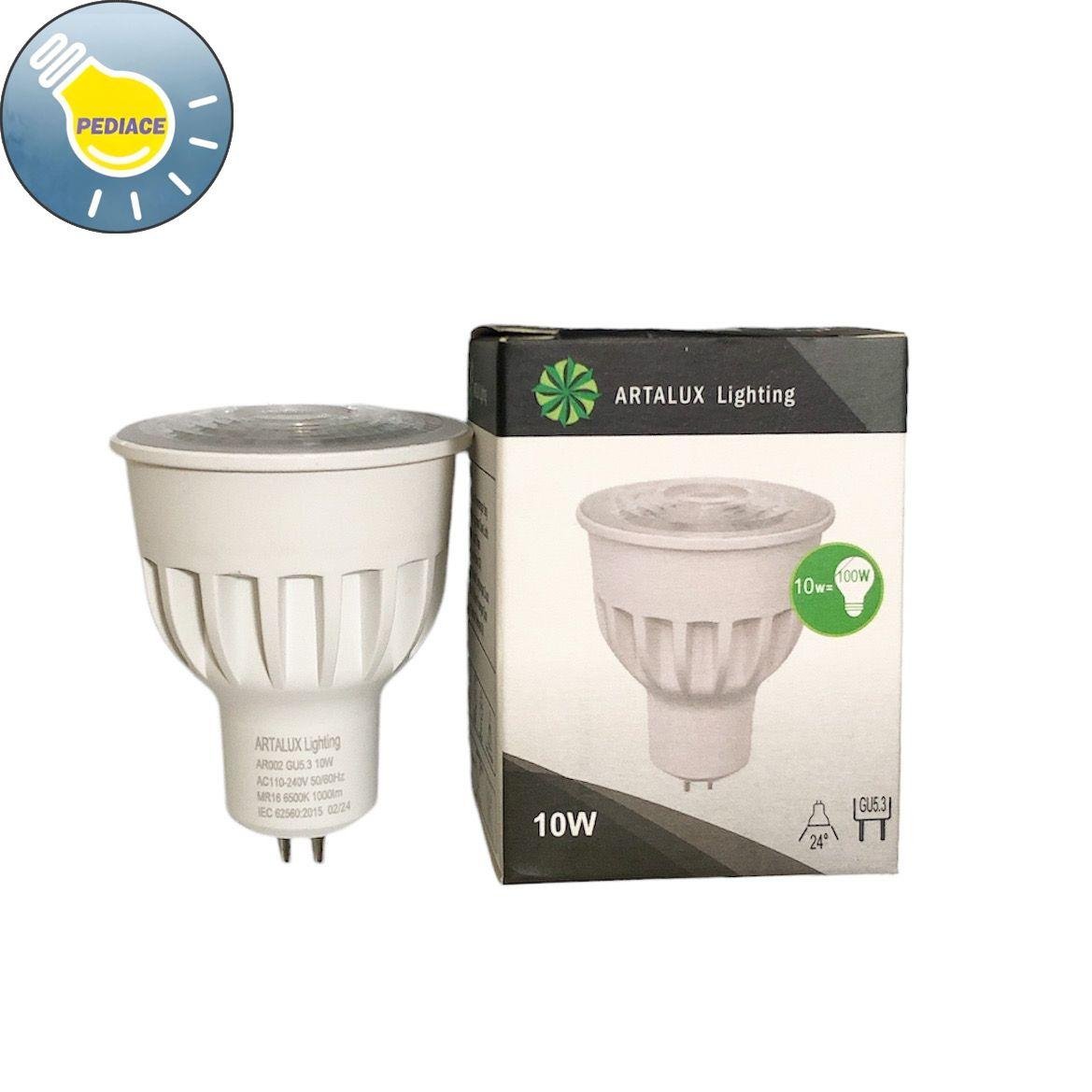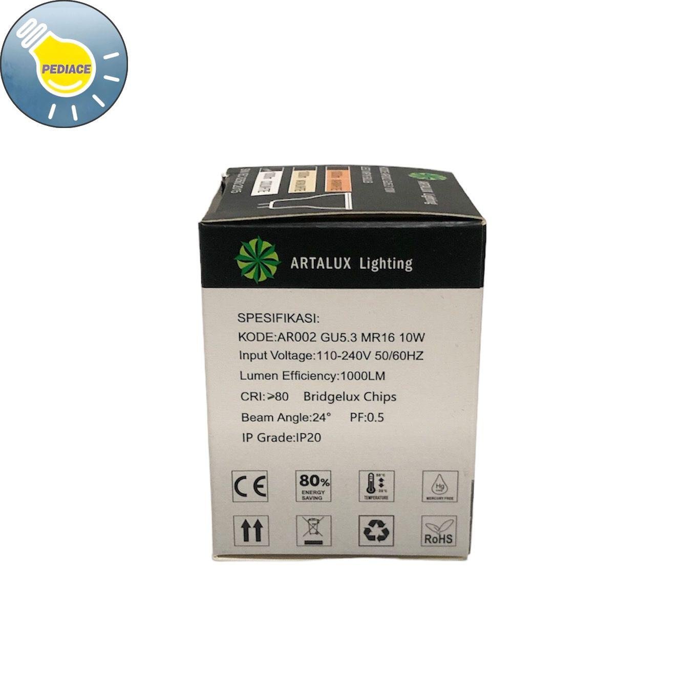Lampu LED MR16 Bulb COB 10W ARTALUX AR002 GU5.3 Cool White / Putih 6500K 1000lm Merk: ARTALUX Kode: AR002 GU5.3 MR16 10W Fitting: MR16 Daya: 10 watt Cahaya: Cool White 6500k Lumens: 1000lm AC110-240V 50/60Hz CRI: gt;80 bridgelux chips Beam angle: 24 derajat PF: 0.5 IP Grade: IP20 Dimensi: 50x50x66mm SNI *Lampu akan dites terlebih dahulu sebelum dikirim