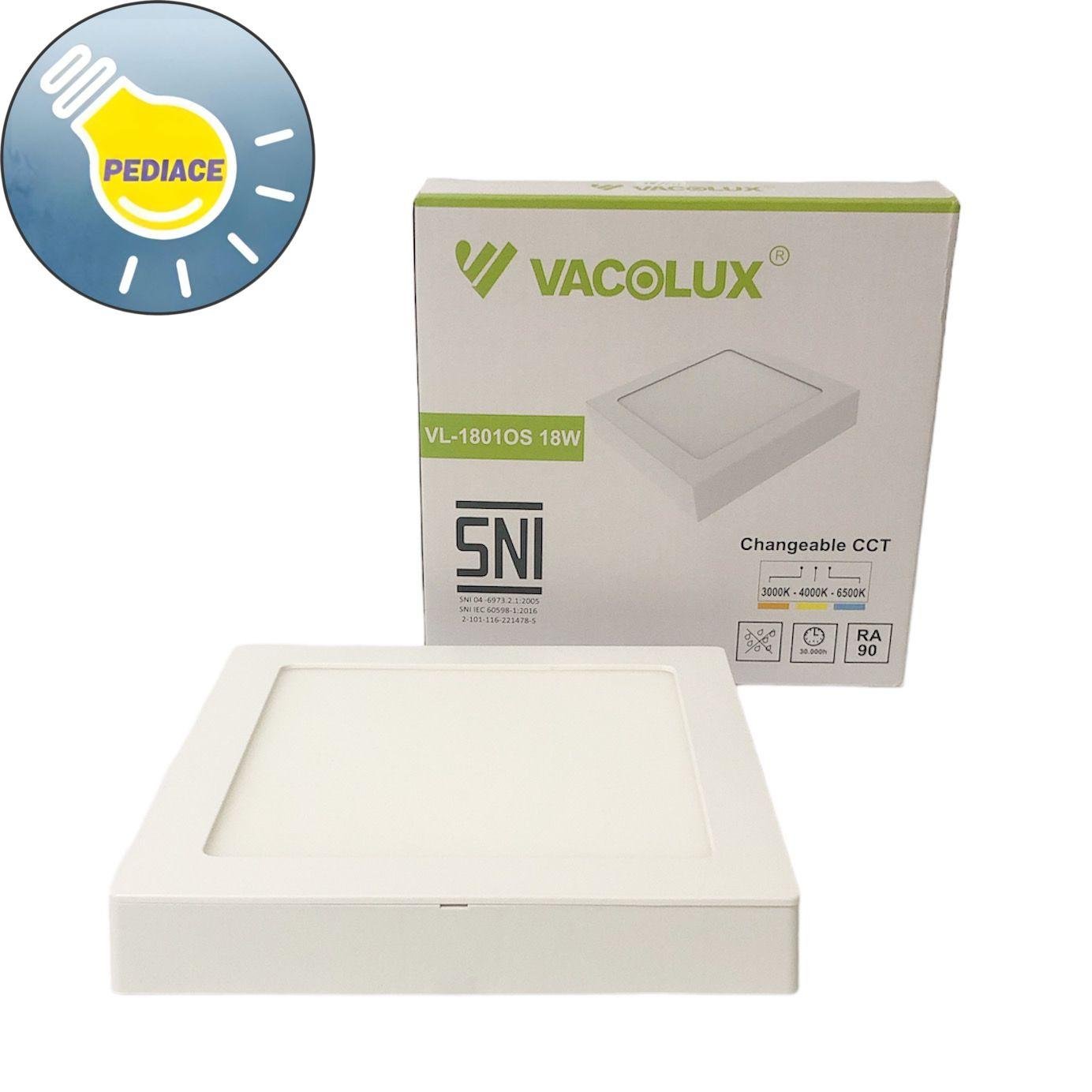 Lampu LED Panel Light 18W VACOLUX Kotak Tempel / Outbow Changeable CCT Tersedia 3 warna cahaya (Warm white 3000K, Neutral White 4000K, Cool White 6500K) bisa ganti sesuai keinginan. Merk: Vacolux Tipe: VL-1801OS 18W Power: 18 Watt Voltage: 220~240VAC,50/60Hz Color temperature: 3000K, 4000K, 6500K Luminuous Flux: 1800lm CRI: Ra ? 90 Bentuk: Kotak / Square Ukuran: ?204x204x33mm Warna body: Putih Material: Flame retardant PC Grade of protection: IP20 Lamp Viewing Angle: 120? Termasuk fischer dan sekrup NEW PRODUCT, ORIGINAL VACOLUX. *Note: Lampu akan dicoba terlebih dahulu dan di packing bubble wrap sebelum dikirim