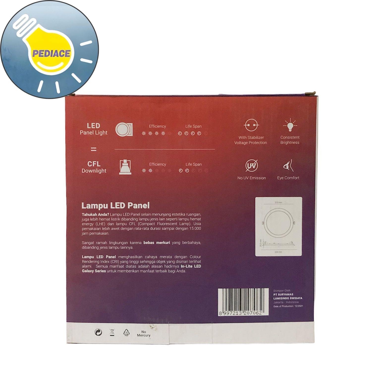 Lampu LED Panel Light Bulat 18W Inlite Inbow SNI – COOL WHITE 4000K – Merk: inlite – Daya: 18 Watt – Voltase: 220 – 240V 50-60hz – Tersedia warna cahaya: COOL WHITE 4000K (Kuning Semu) – Diameter: 224mm – Tinggi: 25.5mm – Lubang Plafon: 210 mm – Bentuk: Bulat (Round) – Bisa langsung sambung ke listrik 220V/ Listrik PLN – High CRI: gt;80 – With stabilizer voltage protection – No UV Emission – Eye comfort – 15.000 Hour long life service Note: Lampu akan di tes dan dipacking bubble serta dus sebelum dikirim