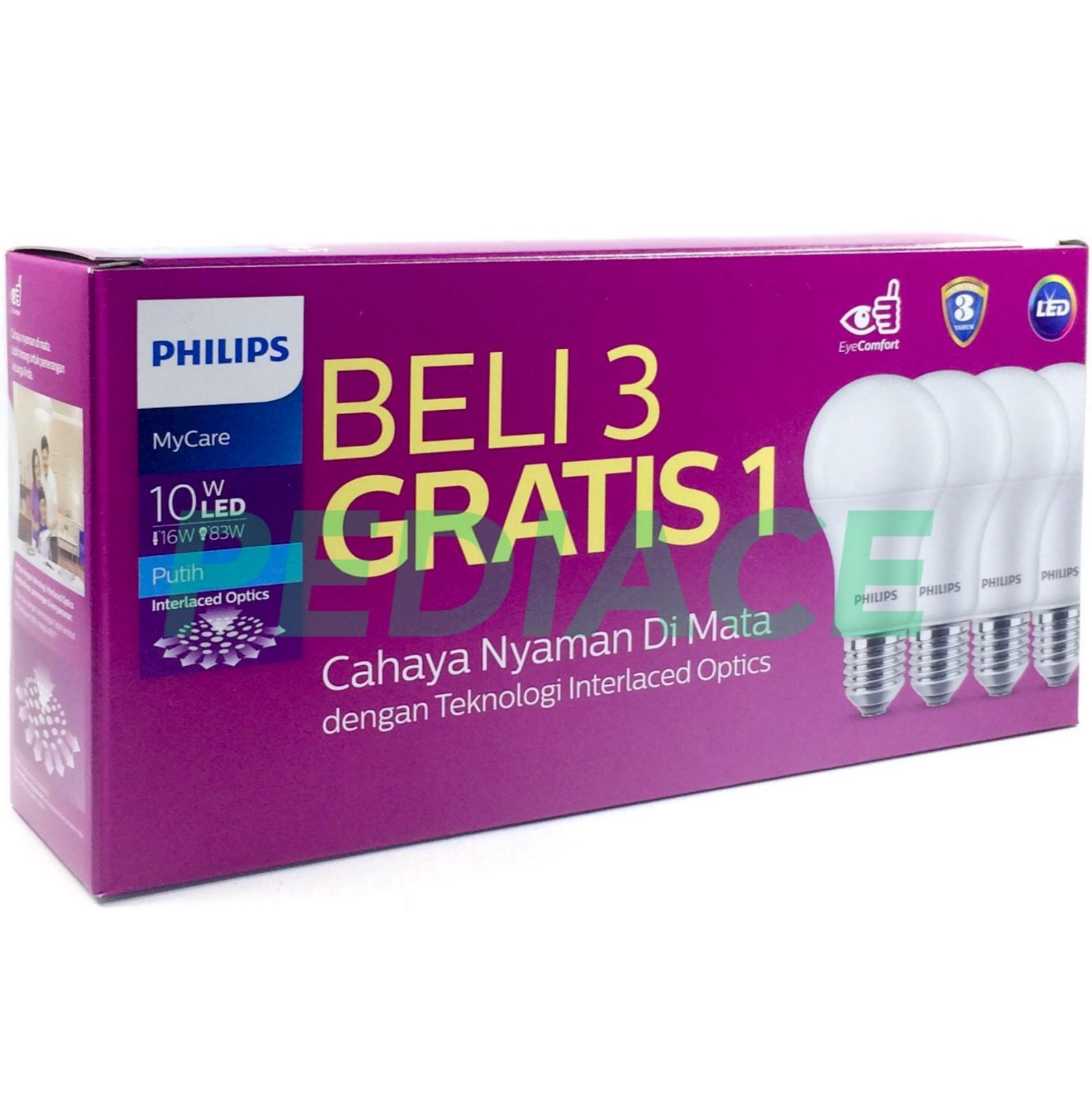 * READY STOCK WARNA PUTIH (COOL DAYLIGHT) 1 Pack dapat 4pcs New, Generasi Baru dengan Interlace Optic membuat warna menyala lebih merata. Daya listrik terukur 10 W Daya yang setara 83 W (GLS) atau 16 W (CFLI) Suhu warna 6500 K Efek cahaya/finish Day Light Kap/fitting E27 Dapat diredupkan: Tidak Voltase 220 – 240 V Masa pakai lampu 15000 jam masa pakai (2,7 jam/hari) 10 tahun Hemat energy 85% Garansi RESMI Philips Indonesia 3 Tahun Call Center Philips Lighting Indonesia (bebas pulsa) * Lampu akan di test dan di packing bubble serta box sebelum dikirim