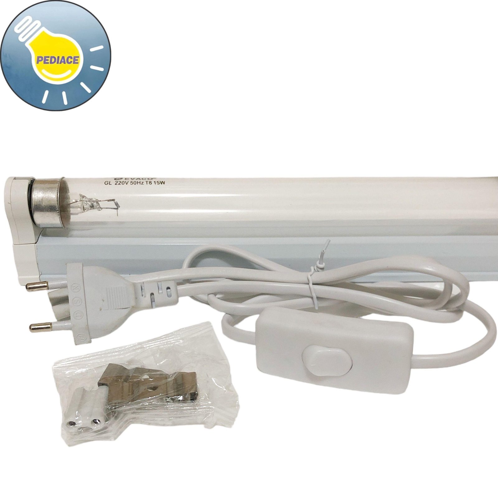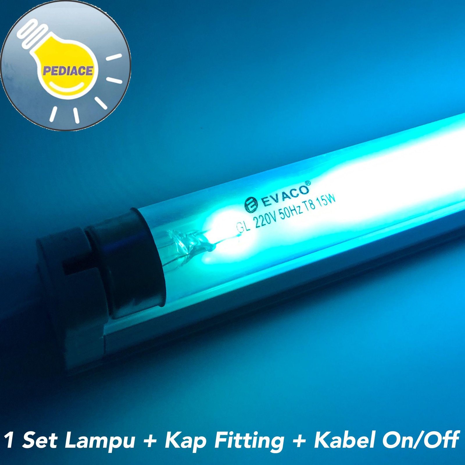 Lampu T8 UV Germicidal 15W Filter Air/Kuman EVACO SET KAP KABEL ON/OFF Lampu Ultraviolet GL Germicidal sterilizer atau disebut juga dengan lampu kuman, lampu filter air dll T8 GL 15watt Harga yg tertera adalah harga 1set komplit yg terdapat -1pcs Lampu T8 UV Germicidal Sterilizer 15 Watt Evaco (panjang lampu -+ 45cm) -1pcs Housing 15watt (panjang kap -+ 46cm) Panjang keseluruhan termasuk rumah/kap nya -+ 46cm – 1pcs Colokan Kabel On/Off (panjang -+ 120cm) Tegangan 220V PERHATIAN: (Lampu ini sangat berbahaya jika langsung kontak mata dan kulit dengan keadaan nyala) Warna Biru jika nyala lampu untuk membunuh kuman Lampu Radiasi Ultra Ungu ( sering disingkat UV dari bahasa Inggris ultraviolet ) untuk sterilisasi bakteri atau kuman penyakit, Banyak dimanfaatkan untuk desinfeksi air dan pemurnian air, atau berguna untuk sterilisasi udara permukaan dari berbagai bahan dan air atau cairan. Sangat cocok di pakai untuk tempat usaha air isi ulang, rumah sakit, kolam, laboratorium, klinik, dll atau tempat tempat khusus yang bertujuan untuk sterilisasi bakteri / kuman penyakit Aplikasi: – Membunuh atau menonaktifkan bakteri virus dan organisme primitif lainnya – Udara, Air dan disinfeksi permukaan di rumah sakit, penelitian dan farmasi lingkungan bakteriologis dan industri pengolahan makanan dan susu, tempat pembuatan bir dan roti – Disinfeksi air minum, air limbah, kolam renang, sistem pendingin udara, ruang penyimpanan dingin, bahan kemasan dll – Digunakan dalam berbagai proses fotokimia PERHATIAN : – Jenis lampu Radiasi ultraviolet – Jangan pernah melihat ke lampu yang sedang menyala – Lindungi kulit dan mata terhadap sinar ultraviolet *Lampu PASTI kami coba terlebih dahulu dan packing aman sebelum dikirim