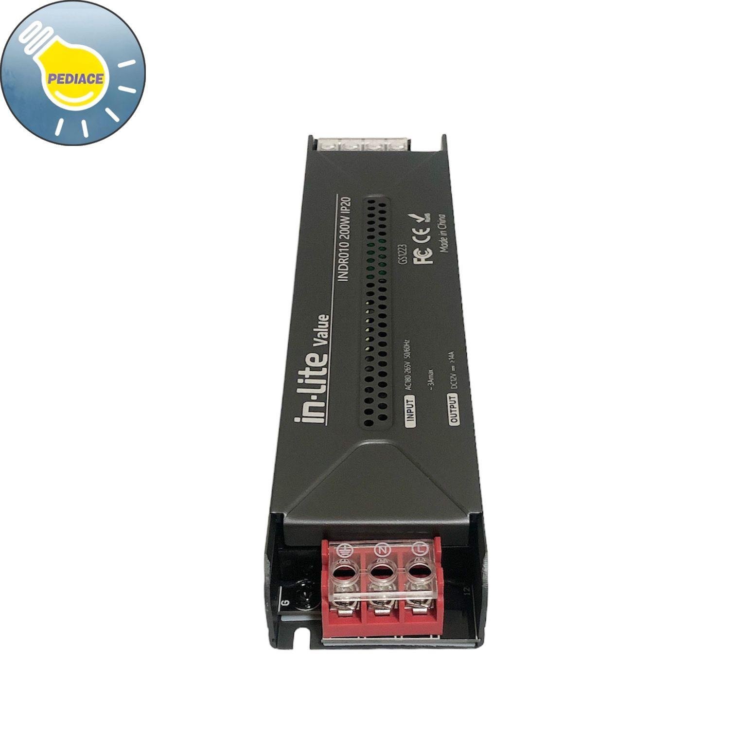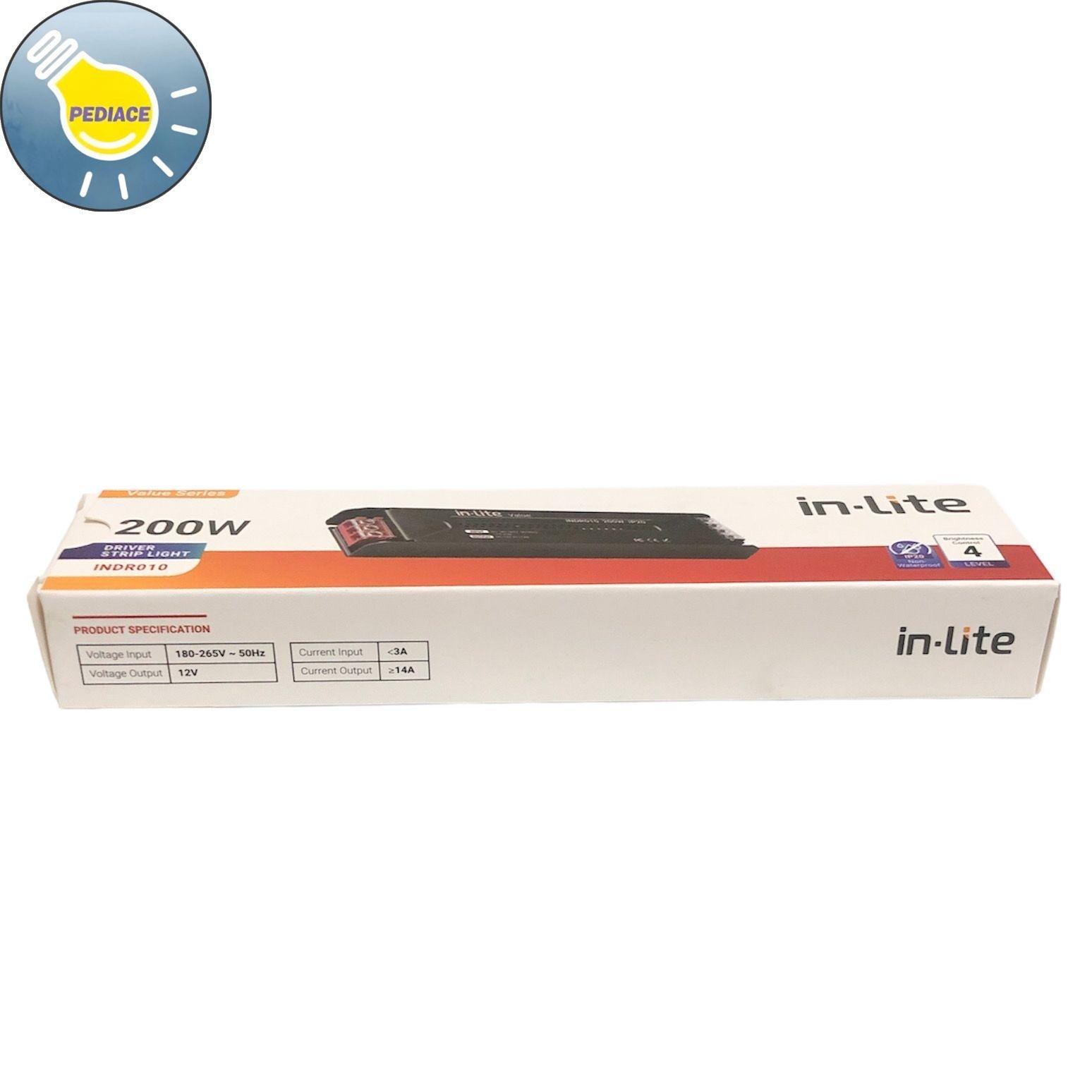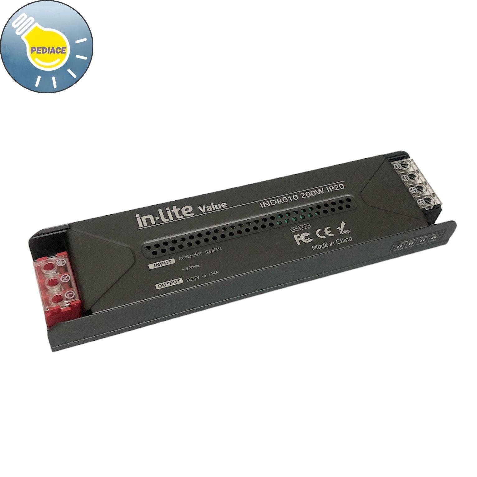 Power Supply Adaptor 12V 200W INLITE INDR010 Driver Strip Light 14A Ballast Trafo IP20 Merk: Inlite Tipe: INDR010 Daya: 200 Watt Input: AC180-265V 50/60Hz ~3Amax Output: DC12V — gt;14A Dimensi -+ 198×48.5×25.5mm IP20 Non-waterproof