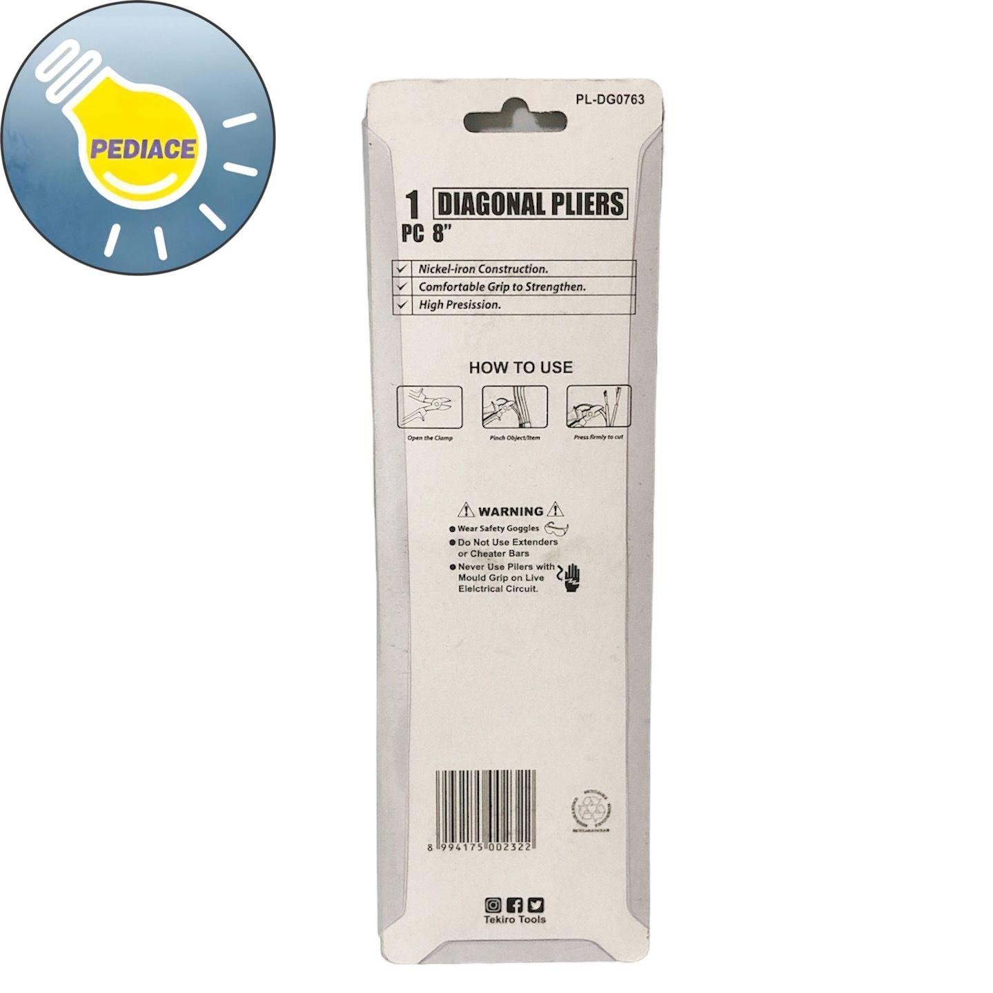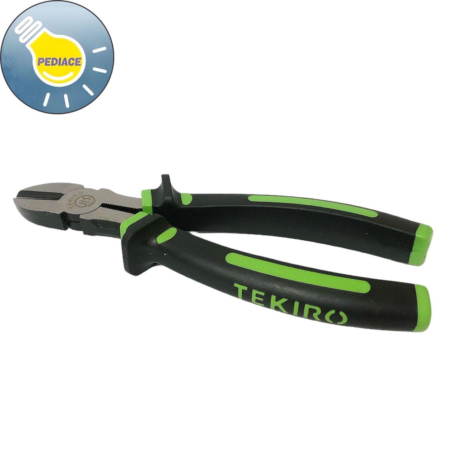 Tang Potong 8 Inch TEKIRO Diagonal Pliers 8 #34; PL-DG0763 JIS TEKIRO Tang Potong [8 Inch] adalah alat yang digunakan untuk mencengkram atau memegang komponen yang akan di buka dengan cara diputarkan bagiannya. Tang ini juga dapat digunakan untuk mengencangkan atau melonggarkan mur dan baut tetapi tidak dianjurkan untuk penggunaan tersebut karena kekuatan cengkraman. Tang terbuat dari baja tensil tinggi sehingga tang sangat kuat ketika dipukulkan pada benda kerja seperti mur dan baut. Dan jika terpaksa tang juga bisa digunakan untuk memukul benda benda yang keras seperti paku yang melengkung dan lain lain. Merk: Tekiro Item Code: PL-DG0763 Ukuran: 8 inch / 20 cm Bahan: High Quality Carbon Steel Gagang: TPR, non slip amp; ergonomis Nickle-Iron Construction Comfortable grip to strengthen High Precision JIS (Japan Industry Standard) Barang dijamin original Tekiro.